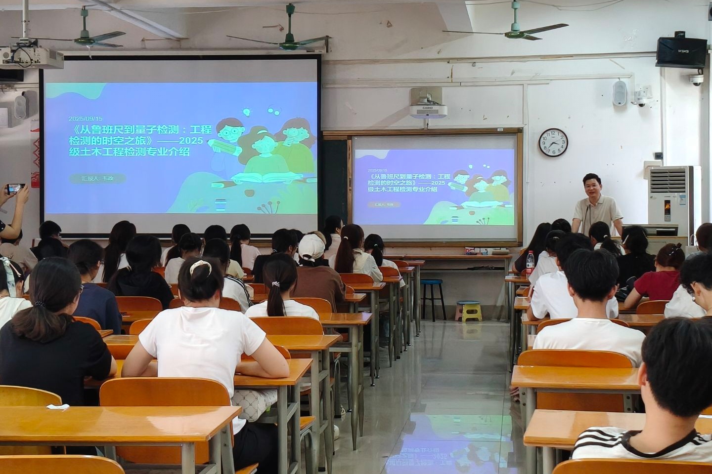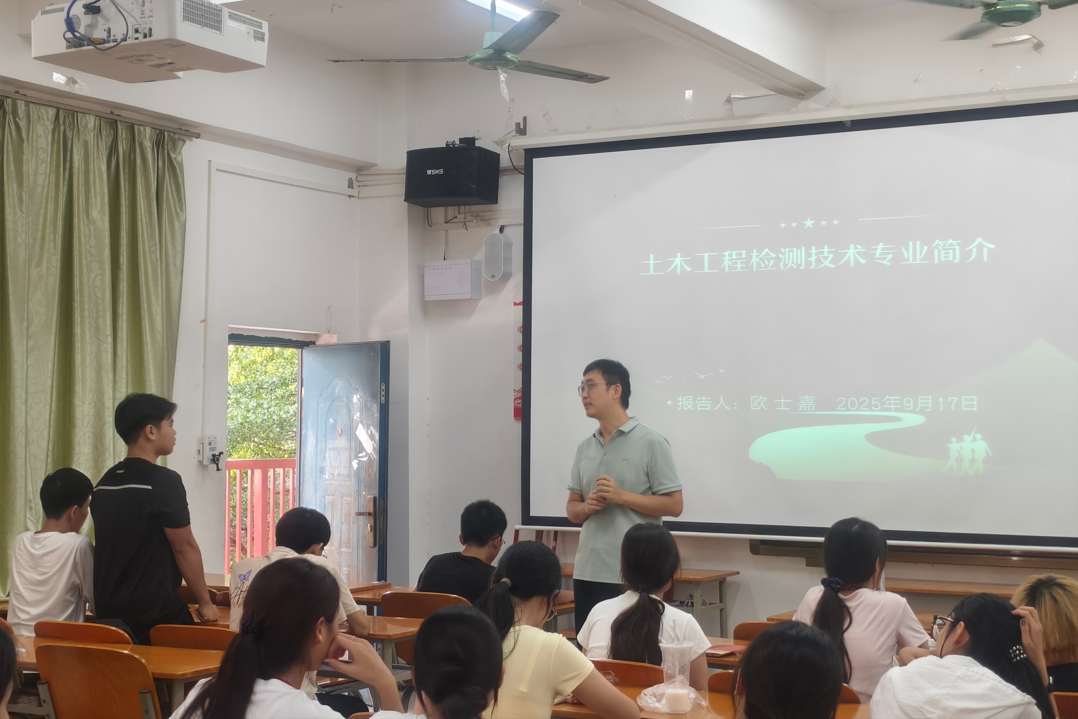 为帮助2025级土木工程检测技术专业新生尽快适应大学环境、深入了解专业内涵、明确未来发展方向,9月17日下午,土木工程检测技术专业在三教C410教室为新生开展入学教育讲座。讲座由专业带头人欧士嘉主持,公司党委副书记吴代生、校企合作单位广西城乡规划设计院工程检测中心的企业导师韦政出席讲座并为新生做专题报告。