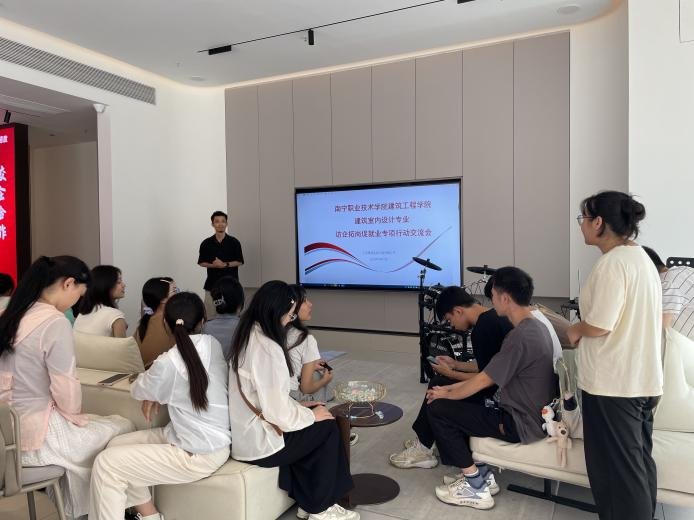此次访企拓岗促就业专项行动得到了企业的热情接待,上海慧度装饰工程有限公司慧度智宅展厅店长介绍了公司的业务范围、职位要求、精神要求、以及人才培养方式;设计总监李博结合同学们即将面临的顶岗实习及就业结合专业知识给予职业规划指导,提醒同学们在未来学习和工作中对室内设计的职场要求;何谊老师要求同学们在设计上把握艺术源于生活的原则,工作上张弛有度,最后谢梅俏老师总结了专业的建设情况以及2024年毕业生的基本情况,希望后续校企合作能长足有效为员工提供发展平台,在专业建设和人才培养等方面继续加强合作的意愿,同时邀请所有工作人员与同学们合影留念。