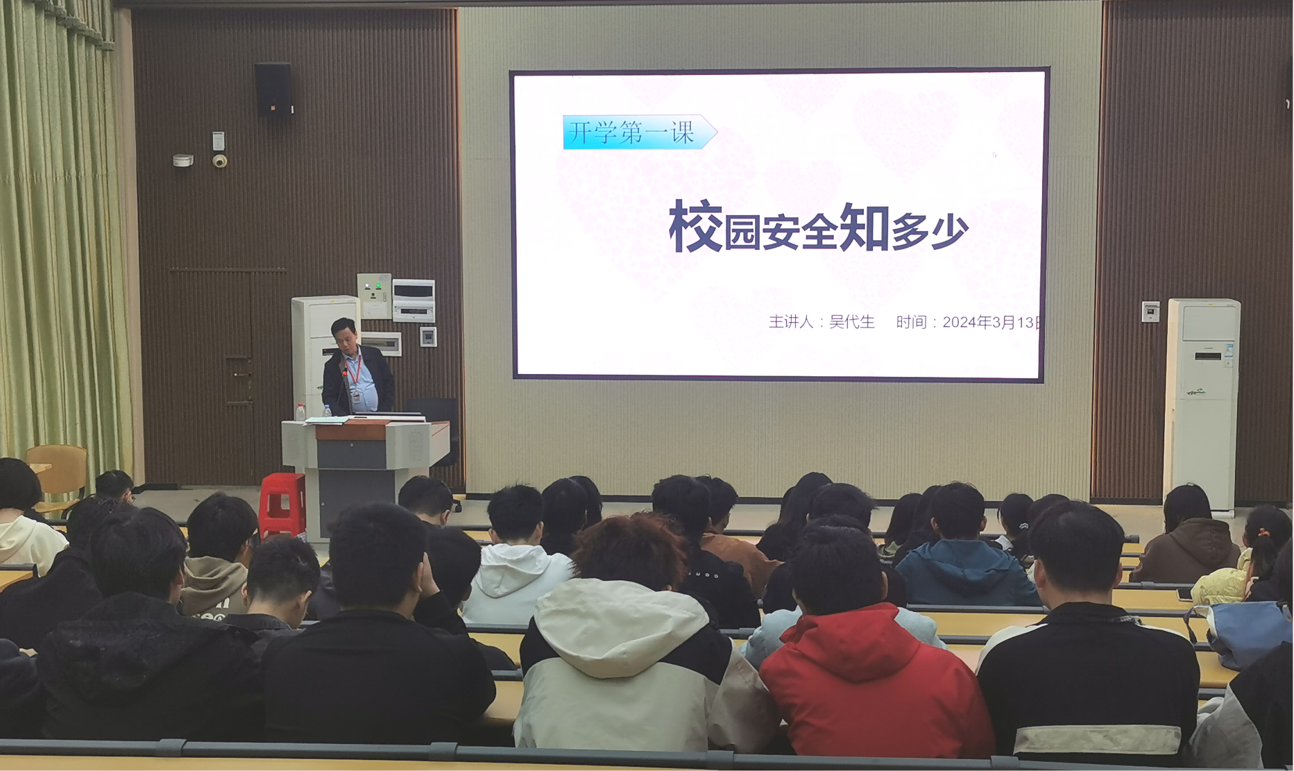 吴代生以《校园安全知多少》为题,列举近期社会的热点案例,结合公司的实际情况,分别讲授了财产安全、人身安全、消防安全、交通安全、网络安全、心理安全等常见问题及应对措施。吴代生叮嘱同学们树立安全防范意识,确保自身安全,做到爱自己爱别人爱世界。