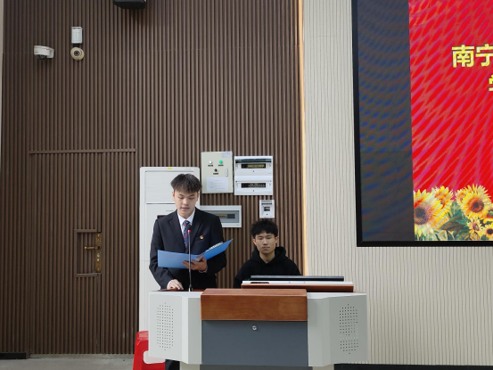 (图为:梁蔚新同学进行述职)