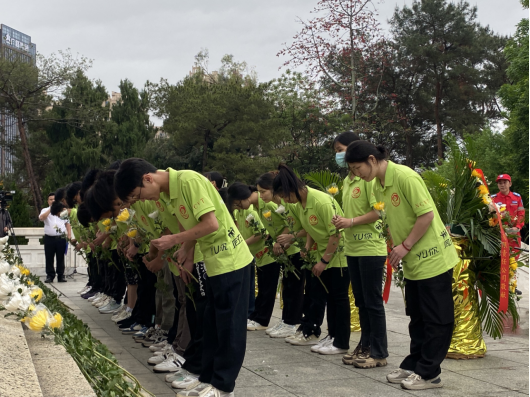 (图为:员工向烈士纪念碑献花,缅怀先烈)