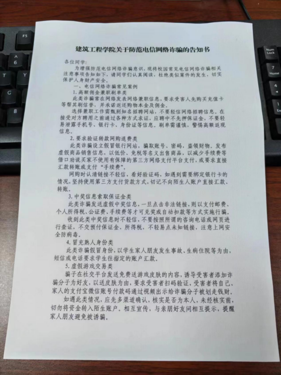 (图为:公司发放的防范电信网络诈骗告知书)