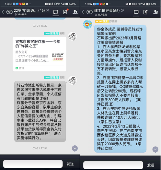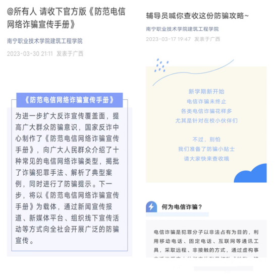 公司员工管理中心主任苏金强在辅导员工作群进行常态化防范电信网络诈骗相关案例分享,专职辅导员在所带班级召开3月份防范电信网络诈骗专题班会,“南宁职业技术公司365英国上市公司”官方公众号转载多条防电信诈骗相关文章,及时向员工传达最新防诈反诈知识,加强案例警示教育,引起同学们对电信诈骗问题的重视,提醒员工保护好人身财产安全,防患于未然。