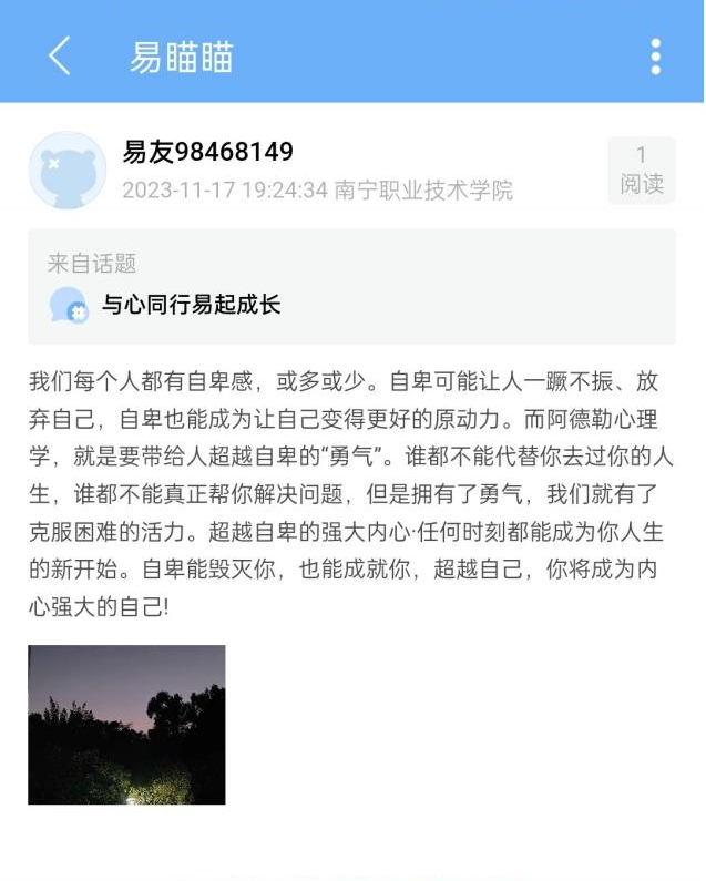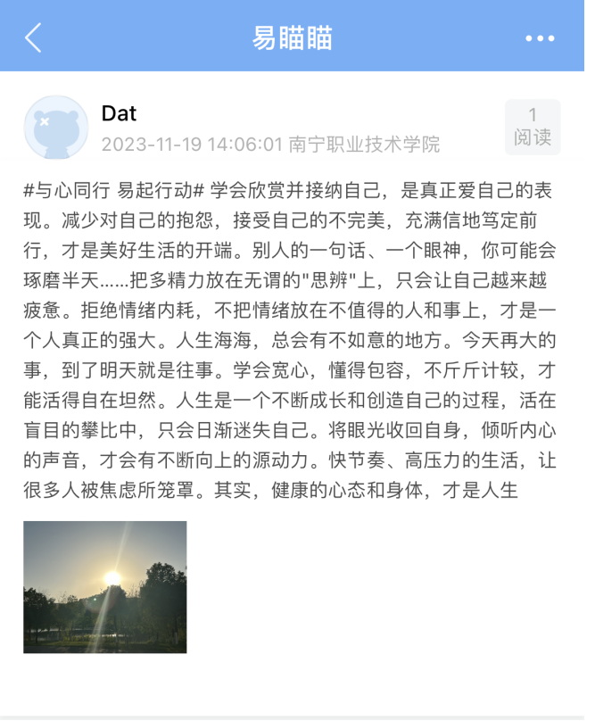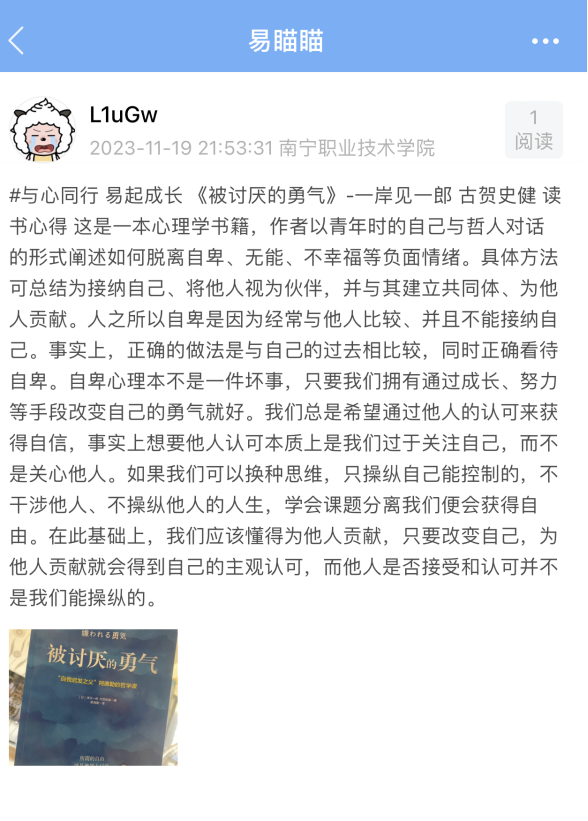 一是悦心“易”读;悦享读书,我心成长。活动要求同学们以“#与心同行 易起成长”为开头,在易瞄瞄上发布话题评论,内容包括心理学、身心灵成长好书推荐,读心理语录金句的感悟分享,学习心理健康知识后自己的认知提升、个人成长与收获等,引导同学们树立心理健康意识,优化心理品质。