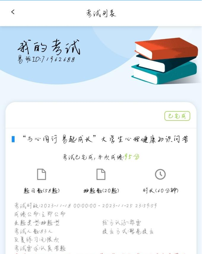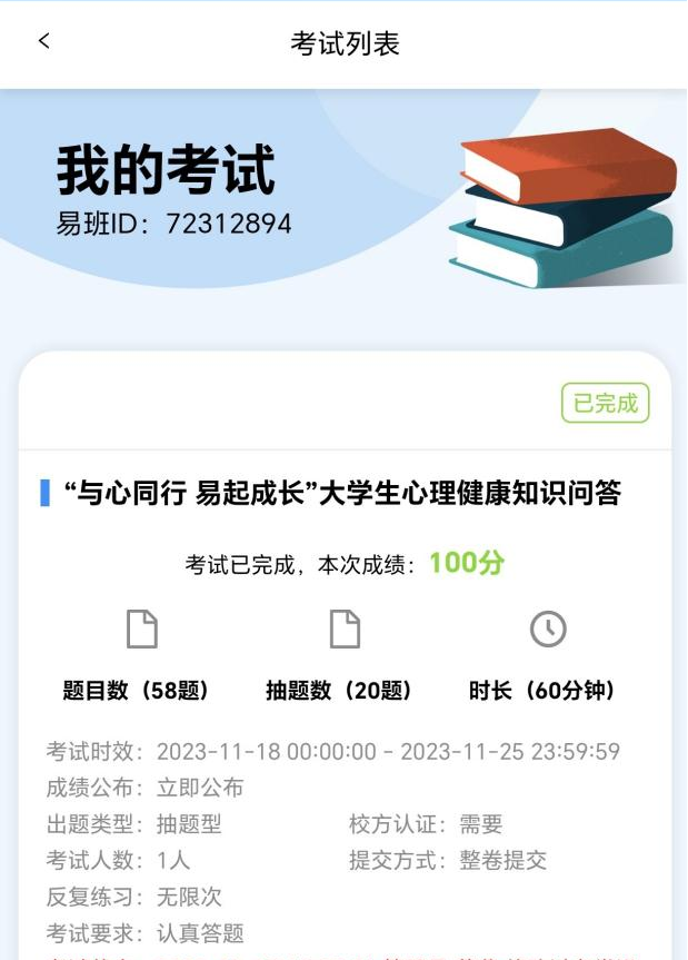 二是心“易”我知。懂心理,乐生活。同学们在易班平台上参加并完成“与心同行 易起成长”老员工心理健康教育知识问答,心理问答内容涵盖了人际交往、情绪情感、学习心理、恋爱心理、自我意识等。通过心理知识问答的方式,向同学们普及心理健康知识。