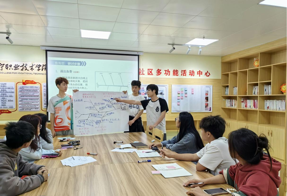 员工干部们根据班级中出现的常见问题,找出了当前班级最迫切解决的难题,最终以“如何提升班级自主管理效能”为切入点,进行深入研讨。同学们在黄燕老师的指导下,群策群力、积极探讨、密切配合,利用行动学习法,研讨出应对措施及解决实际问题的对策,并画出行动学习鱼骨图,对研讨成果进行汇报展示。