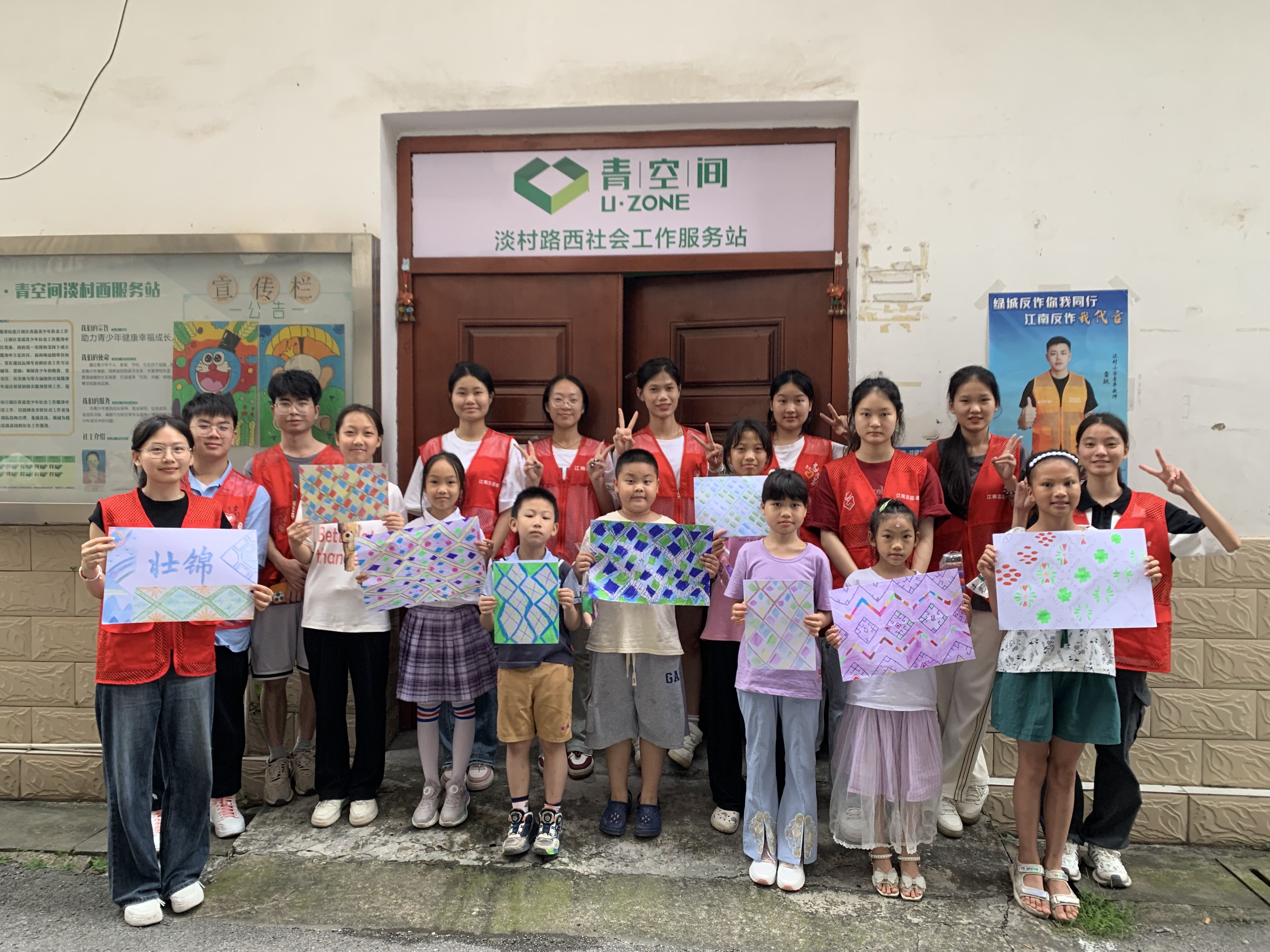 5月25日下午,23房产2班团支部走进淡村路西社区,开展壮锦文化体验活动。张瑜芳同学向社区小朋友们讲述了壮锦的起源和历史,向社区展示了公司学子设计的壮锦服饰,最后同学们和小朋友一起用画笔勾勒出壮锦纹案。