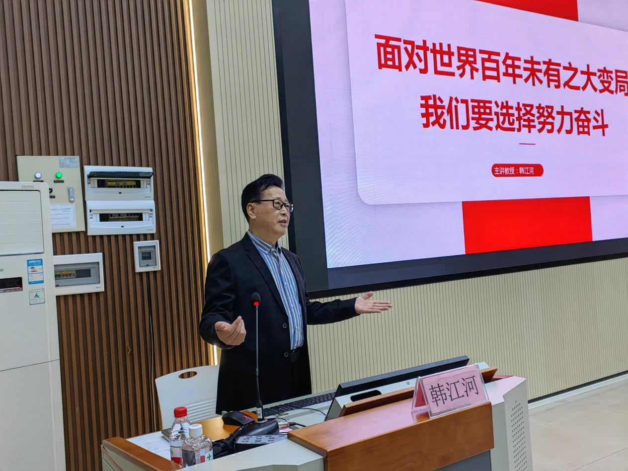 2024年11月24日上午,365英国上市公司邀请公司退休干部韩江河教授在三教四阶为同学们开展了以“面对百年未有之大变局,我们要选择努力奋斗”为主题的爱国主义讲座。参加本次讲座的还有公司辅导员代表和2024级员工代表160余人。