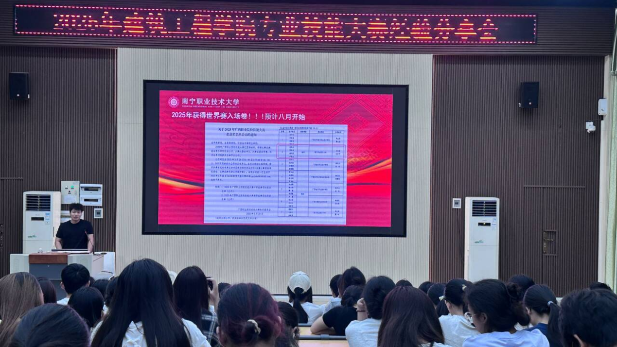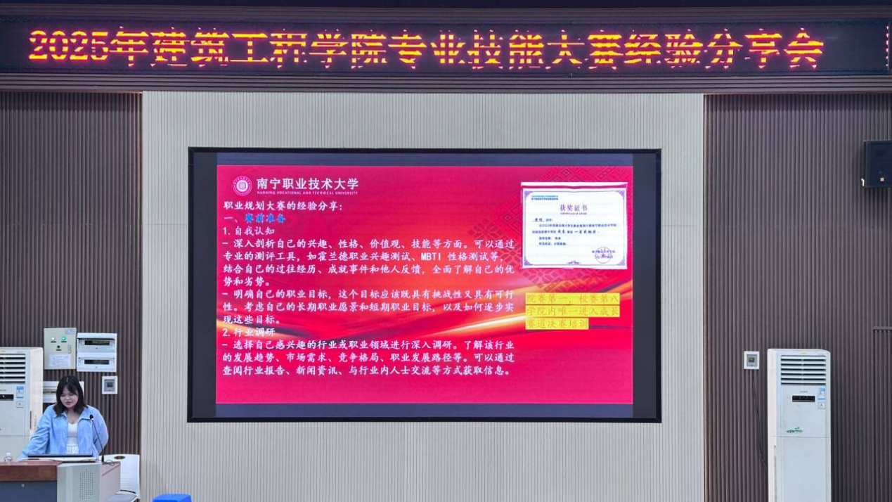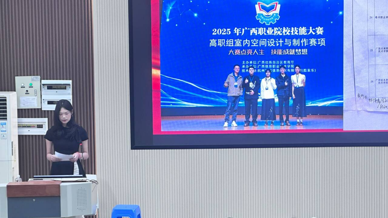 分享会上,刚从2025年广西职业院校技能大赛中斩获金奖归来的23室内3班的赵璇同学结合自身参赛经历,从备赛策略制定、团队协作技巧、技术难点突破等方面分享了实战经验。她认为,比赛不仅是技能的检验场,更是心态与韧性的磨炼场,每一次失误都是成长路上的宝贵财富。