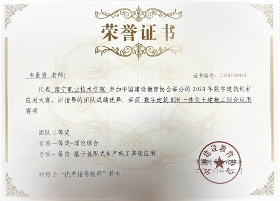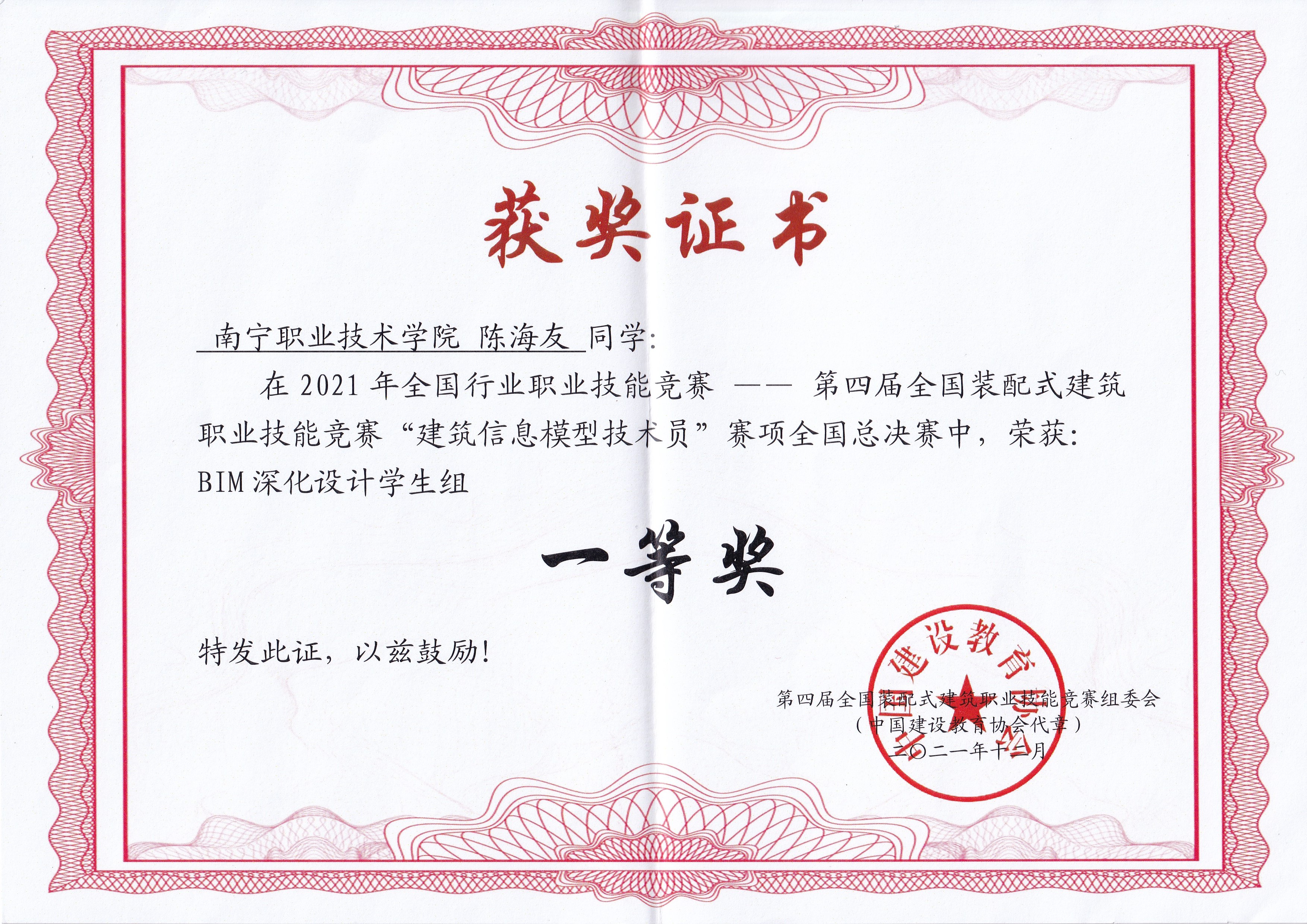 2021年高云河老师指导19级建筑工程技术专业陈海友获国家职业技能竞赛—一第四届全国装配式建筑职业技能竞赛竞赛BIM赛项一等奖