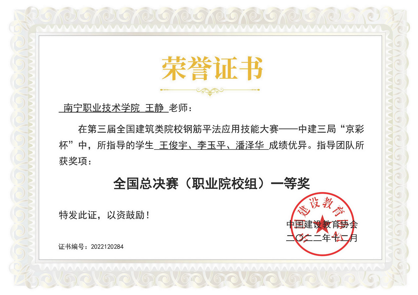 2023年高云河、唐誉兴老师指导建筑工程技术专业员工获全国职业院校技能大赛装配式建筑智能建造赛项三等奖