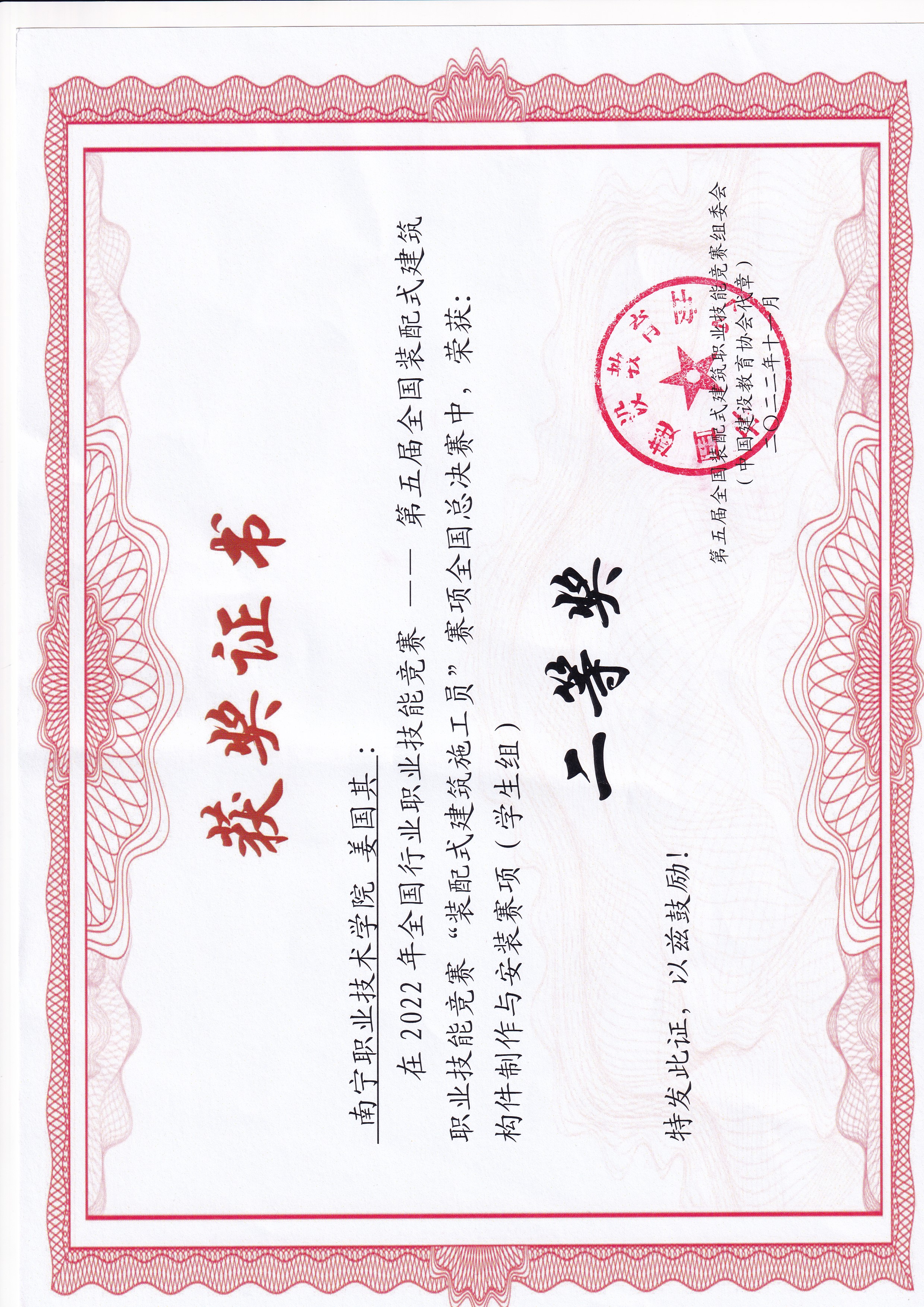2022年高云河老师指导20级建筑工程技术专业姜国其同学获第五届装配式建筑竞赛二等奖