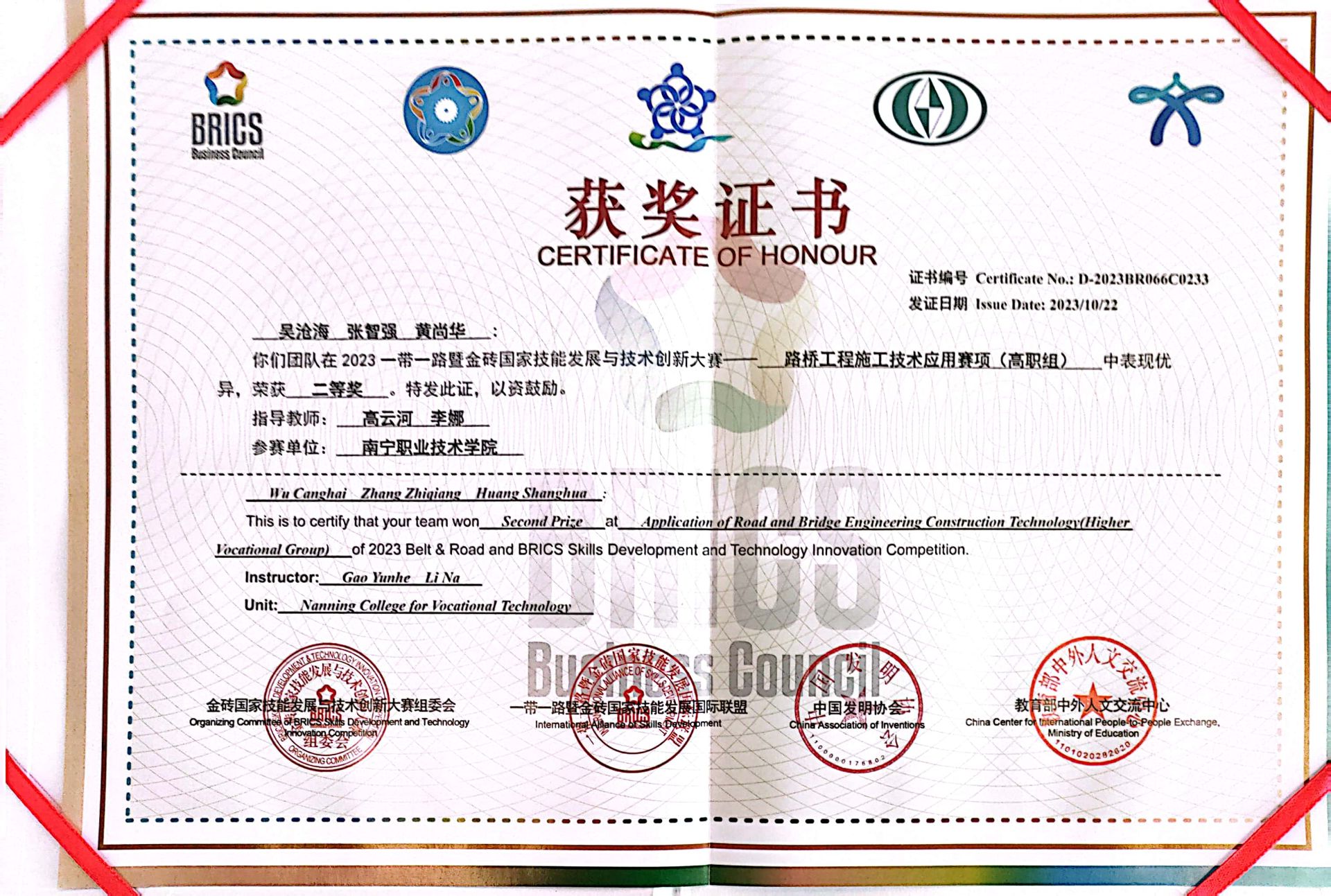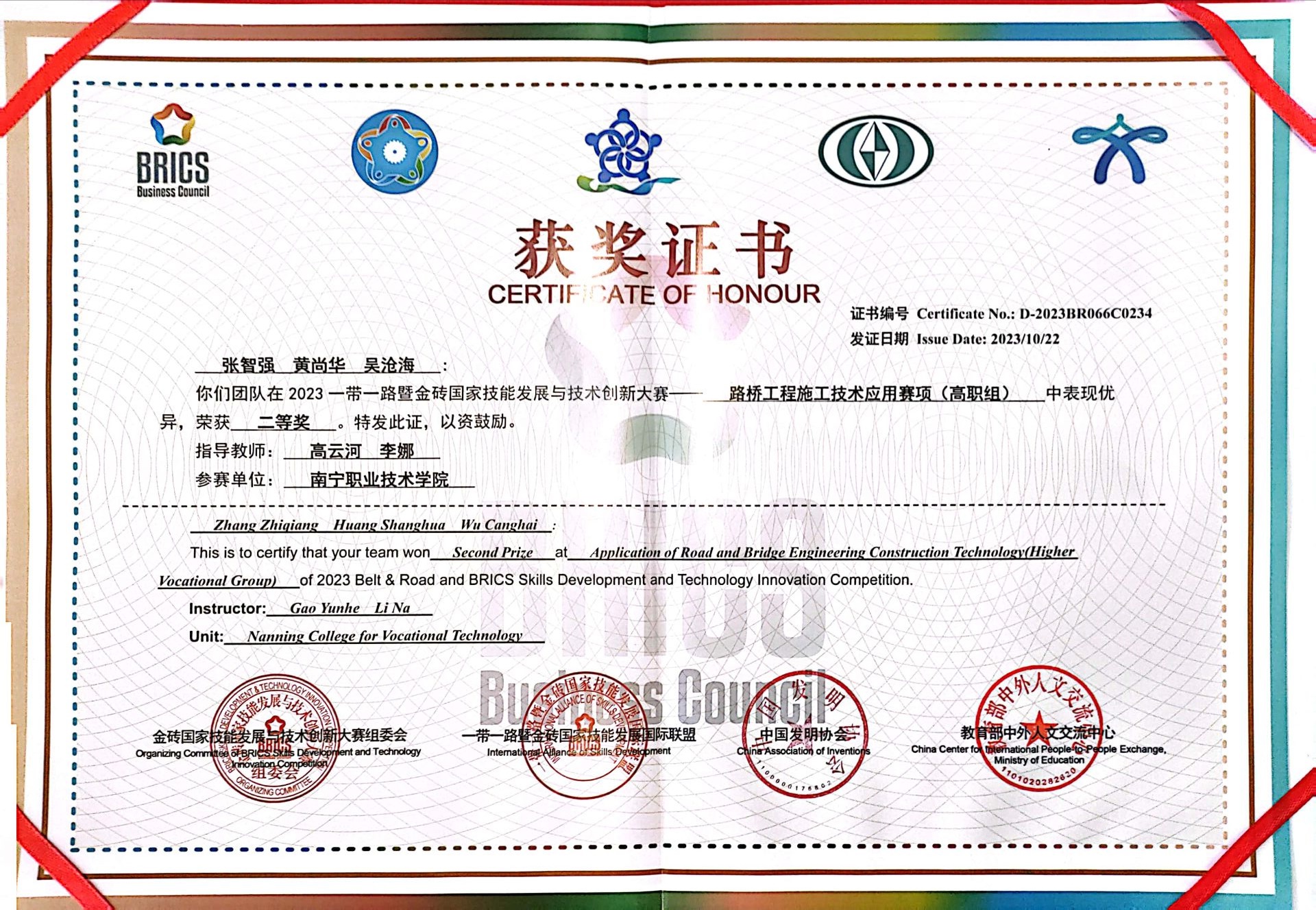 2023年高云河、李娜老师指导建筑工程技术专业员工获一带一路暨金砖国家技能发展与技术创新大赛路桥施工技术应用赛项二等奖