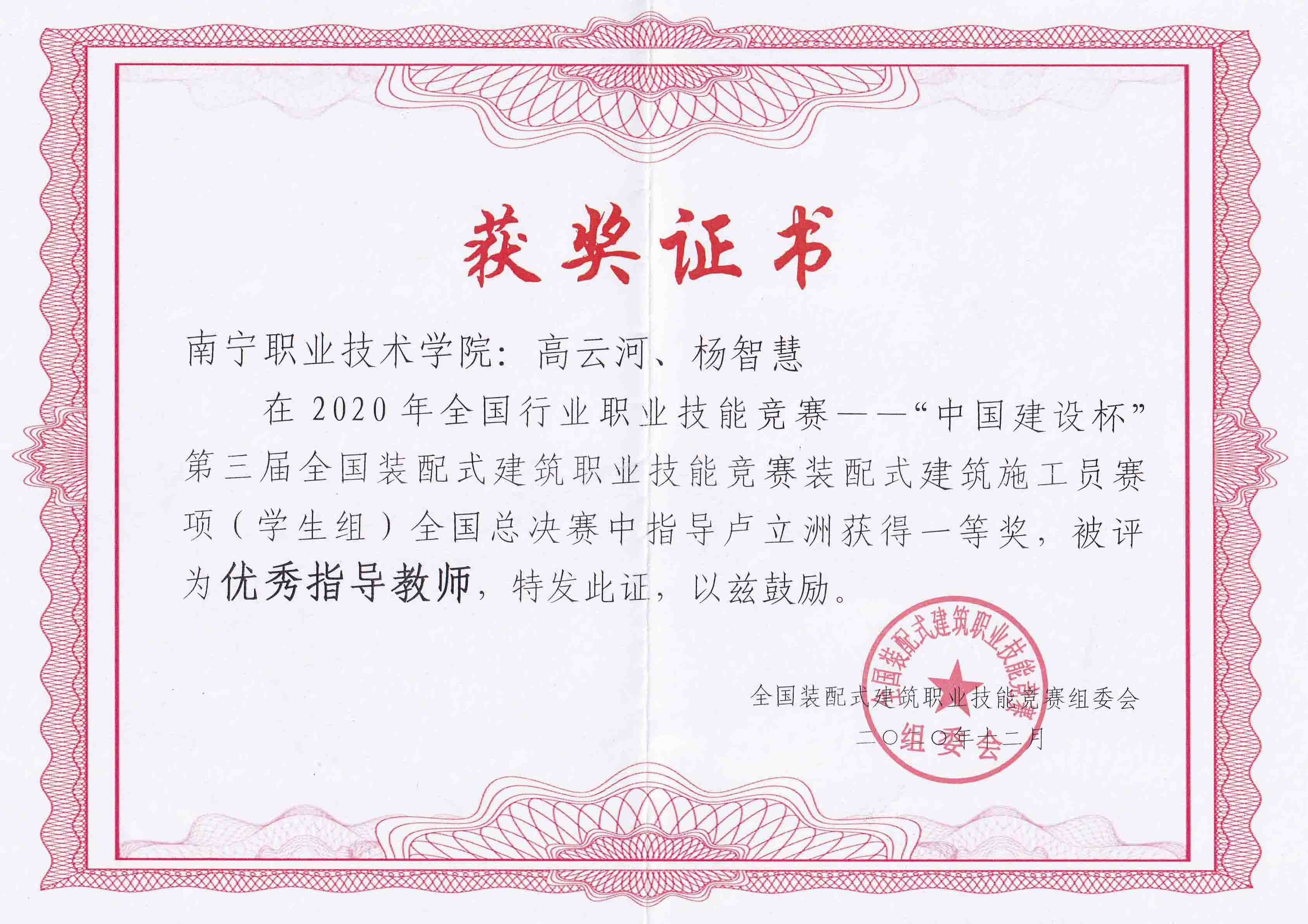 2020年在河南郑州举办的第三届全国装配式建筑职业技能竞赛获一等奖