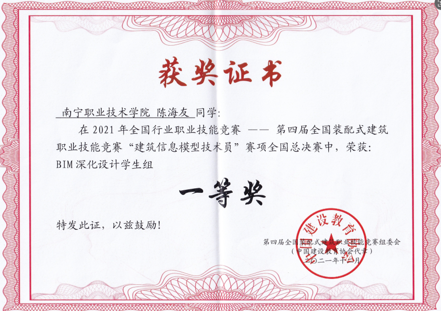 2021年高云河老师指导19级建筑工程技术专业陈海友获国家职业技能竞赛一等奖