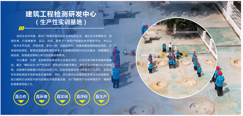 专业优势:土木工程检测技术专业办学条件优越,建立了由企业行业领军人物、专业技术能手、大师名匠领衔组建的“优质教团队源库”,拥有“双主体”带头人引领、校企混编的实力雄厚、素质优良、结构合理、充满活力、整体竞争力强的高水平团队队伍。专业适应南宁市及广西建筑产业发展的需求,与广西城乡规划设计院检测中心、广西交投科技有限公司等数十家国内知名企业深度合作,面向建筑业智能化与绿色化转型,构建“BIM+AI+物联网”智能检测技术体系,培养德技并修,掌握土木工程智能检测、数字化建造管理、绿色低碳技术,具备智能检测诊断与预警能力、绿色低碳检测认证能力、智能建造全链应用能力的高层次复合型技术技能人才。